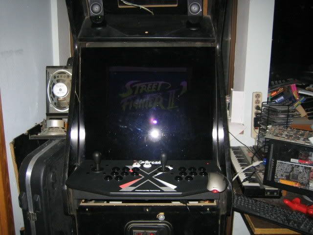 My room has become a veritable arcade, now that I found a cabinet at the dump and my friend got another from his work and gave it to me, all within the span of a month! The one I found at the dump used to be Tournament Arkanoid, but it wasnt working of course, so we replaced the monitor with a 21" and the trackball with a 2player Xarcade, and soon Im going to replace the marquee. I've got the newest version of Mame32 on there with 837 games and counting.