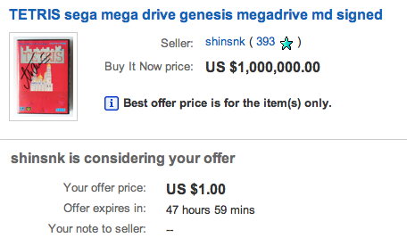 Yeah I get that there are only like 10 copies of this thing, but a million dollars, come on. Just the practicality of making that sale is off. How many people with millions of dollars to toss around are into retro game collecting, and even if there is one, I doubt they got to be millionaires by throwing their money around like that.