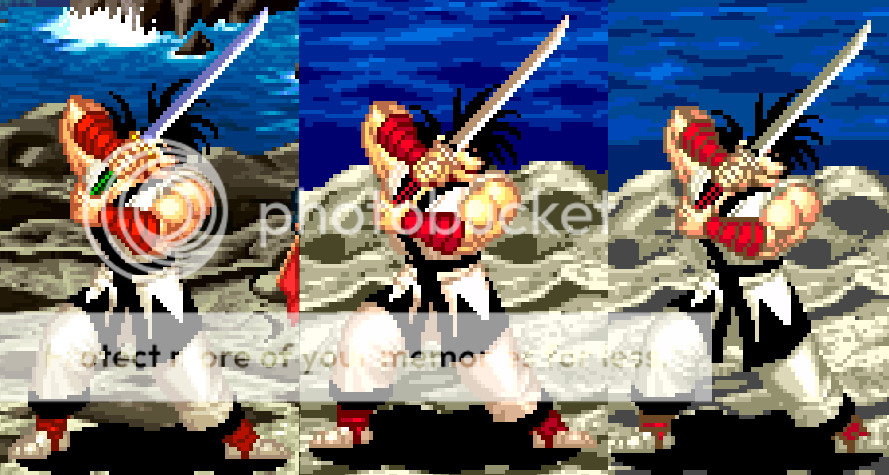 My main gripe with your WIP screenshot was that I liked the bright colors of Haohmaru's stage, and the original sprites (aside of Ukyo, I will admit tht) but now I can see that even Haohmaru looks better with your changes. - I do however prefer the white/grey tones for Hoahmaru's cloths in the original port over your slightly pink-ish edit, the original was closer to the arcade.